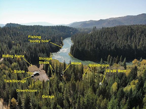 Absolutely gorgeous 21+ acres (two separate parcels, each with river frontage) with 1650'+ ft of Priest River frontage, bordered on 2 sides by 1000's of acres of Federal and State lands. Charming 2-bedroom home with vaulted ceilings, bonus loft, kitchen, living/dining area, spectacular and expansive river views. Detached 24'x36' 3-car garage with concrete floor, small guest house/cabin, 36'x36' barn with loft, two-stall horse barn with riding arena, multiple storage/tool/tack room sheds, wired for backup generator. Trails throughout the property. Hiking, boating, skiing, kayaking, hunting, and world-class fishing literally out your back door. 15 minutes to Priest River, 20 minutes to Priest Lake.