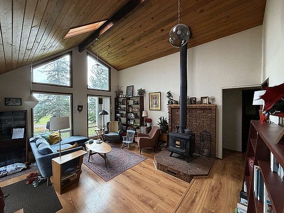 Large deckNestled in a meadowSurrounded by lush forestsOversized windowsAbundant natural lightCozy wood stoveEstablished fruit trees