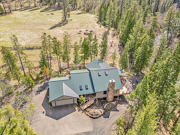 Discover an extraordinary ranch spanning 20 irrigated acres with Big Butte Creek frontage and BLM land across the creek. This exceptional Northwest home blends luxury and functionality with an innovative geothermal heating/cooling system and a robust generator ensuring uninterrupted comfort. The spacious 5-bedroom home features luxurious heated tile floors in the master bedroom, walk in closets, elegant tile shower with soaking tub. With Stunning knotty hickory cabinets and doors throughout, this custom home offers everything. You'll enjoy the private deck off the kitchen with sounds of the creek rambling below. An oversized garage and a massive 25 x 35 insulated shop provide ample space for vehicles, equipment, and workspace. The property offers a nice pond, large meadow, towering trees and natural beauty. Creating an ideal retreat for those seeking privacy, efficiency, and breathtaking landscape views. Careful, once you tour this home, you won't want to leave. Oregon Dream!