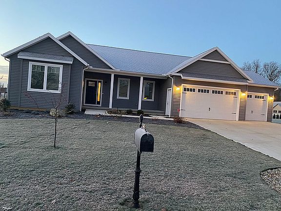 Like brand new without the hassle of building or dealing with material shortages. This sprawling ranch offers 4 bedrooms, 3 baths with private split floor plan and open concept living space. Eat-in kitchen features quartz countertops, soft close custom cabinets, and RO filtration system. Finished area of the basement provides private suite or office and additional living room / home theatre area and there is plenty of room to expand the lower level living space. 3 car attached garage with electric car charging station. Covered concrete back patio overlooking your private miniature apple orchard. Home is conveniently located in quiet neighborhood with city utilities. Call for you personal preview of this beautiful home.