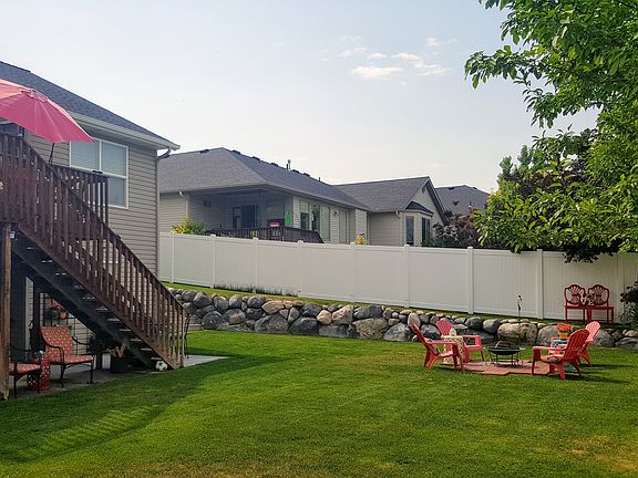 Text Christina at 208-406-8602 for more info. Agents welcome. One owner home, well maintained, and well loved. Enter into a spacious great room with cathedral ceiling. Sunny and bright and welcoming. Open floor plan with high ceilings, large windows, and great light. Kitchen with custom wood cabinets, large pantry, breakfast bar offering plenty of counter space is open to the dining and living rooms with direct sight lines. Living room with built in gas fireplace and beautiful wood cabinet. Separate main floor laundry with storage. Ceramic tile and LVT wide plank flooring upstairs - 100% waterproof and scratch resistant . Large master suite with full bathroom - dual vanity, jetted tub, shower. Walk in closet with custom shelving. Two additional bedrooms and full hall bathroom upstairs. Custom Levolor blinds throughout the first floor. Completely finished walk-out basement with 2 large bedrooms, custom closets, bonus sewing/craft/office room, full bath, multiple storage areas, and a giant family room. Basement finished by original builder (professional and quality) - one of the best in the area. All rooms have large, bright windows. Big, flat backyard with patio, wood deck, rock wall, and full vinyl privacy fence. Room for kids, dogs, games, bbq's, and family gatherings. Yard has multi zone irrigation system. Three car garage with extended third bay for even more storage - shelves can stay. Fiber internet installed! Perfect location! Quick walk down the hill to the Wellness Complex. Neighborhood kids walk to Gate City Elementary. Close to all the action but tucked into a quiet little corner. Text Christina at 208-406-8602 for more info. Agents welcome.