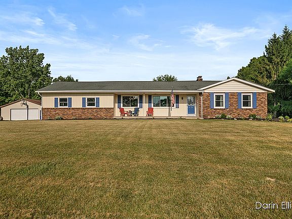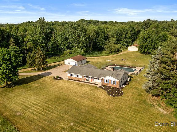 Sprawling ranch with an unbeatable country setting on 10+ Acres in Ada TWP. Nearly 3,000 sq ft, 5 Bed, 2 Full Bath home. Awesome living space with large open kitchen dining and family room with beautiful wood fireplace and sliders to rear patio area. Formal dining area and living room with private country views through the new front picture windows. All appliances included. Large Master Bedroom with double closets Main floor laundry room. Full daylight basement with Great Room and huge 5th Bedroom. Tons of storage. Home is mechanically sound with newer furnace, C/A, and H2O Heater. 2-stall attached garage, 32x32 detached garage, and the icing on the cake is a 30x60 pole barn that was previously used for horses. Gorgeous property with woods, trails, and pond areas. Rear Patio overlooks beautiful inground pool. Home has newer gutters and Everdry System with a transferrable lifetime warranty. This is a must get off the couch and come see property. Point Broadband internet at your fingertips!