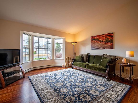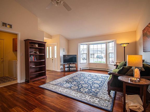 FANTASTIC CONDITION and great location! 3 bedrooms, 2 baths, 2 car garage. LOCK AND LEAVE. HOA does front yard maintenance. Vaulted ceiling in large living room, new paint throughout inside, new carpet and LVT flooring, newer boiler and hot water heater and surround sound. Washer and dryer are not included.