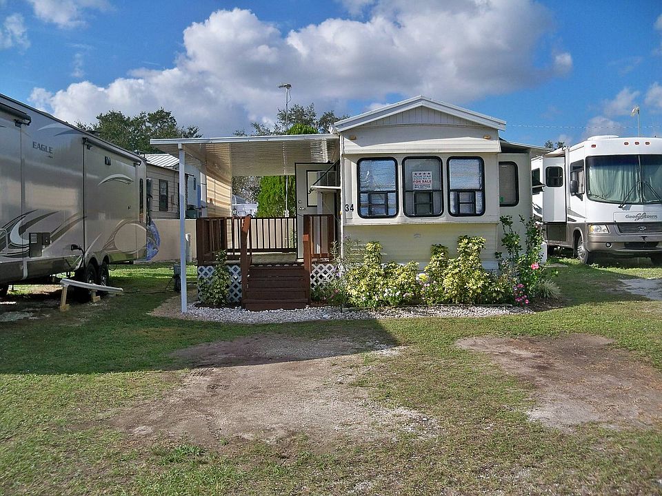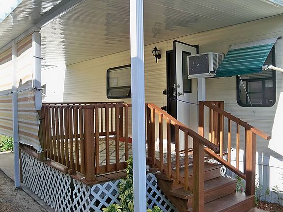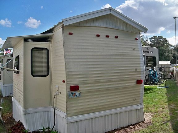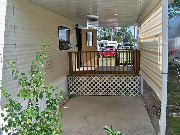 Well Kept Furnished 1999 1 BR 1 BA 8 X 38 Travel Trailer with 2 Tip Outs. Home is set up a permanent home with nice landscaping, Tie Down, Residential Electric and plumbing covered 8 X 16 Entryway deck with storage underneath and 10 X 11 patio, Other features include vented build in Microwave, Propane stove, 2 Refrigerators, Shower tub combo with handicap bars, Queen size bed with mirrors, Sofa Bed for overnight guests, Newer Metal Roof Over, And 2 Windowed AC With Awnings, Home Is A Must See.