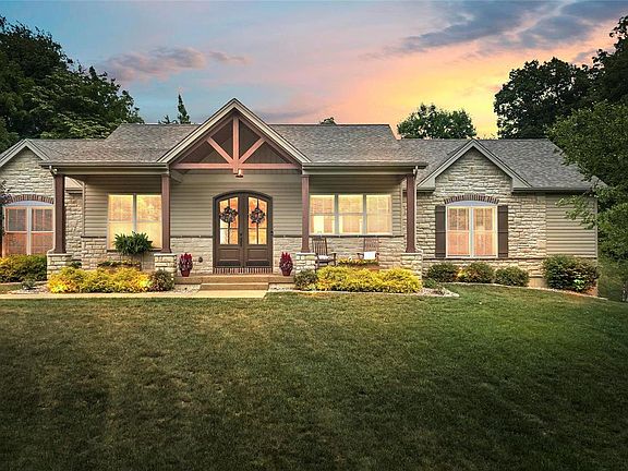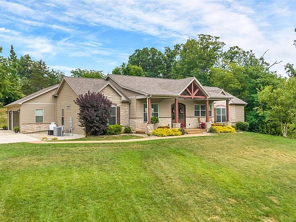Many manicured homes and lakes lead you to this rustic hilltop home with a wide open floor plan, hand-scrapped hardwoods and 10ft ceilings. There is lots of lighting and many windows for a 360° view around your home. Spacious for entertaining large crowds! Amish cabinets and a pantry offer plenty of storage space. A prep sink and kitchen sink allows for plenty of cooks in the kitchen. The home offers a split bedroom floor plan with bedroom 2 & 3 sharing a jack n jill bath. The primary suite has views out the front and back of the home and a bath with an adult height double vanity, jetted tub, tiled shower and water closet. Off of the oversized 3 car garage there is a mudroom, laundry and a large half bath for guests. Behind the great room is a sunroom/office that shares a see through stone fireplace. The walkout LL has some drywall and cedar board walls, still looking for finishing touches. Aggregate patios, a composite covered deck and beautiful landscaping add outdoor charm! Additional Rooms: Mud Room, Sun Room