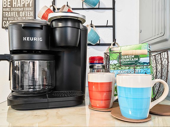 The kitchen is complete with dishes, cookware, cooking and eating utensils, coffee pot and Keurig. Cabinets are labeled for your convenience. The first aid kit and fire extinguisher