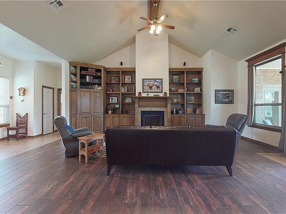 Beautiful well kept home on a 1 acre corner lot. Recently updated with new paint, new carpet, new windows, and new fencing. Features include a 12x24 shop with upper decking, oversized garage with extra storage space, a 12 person storm shelter in the garage floor, a large covered patio, and a large porch. Oversized living has wood look tile flooring, built in bookcases and entertainment center, and 15' vaulted ceiling. Spacious kitchen has a breakfast bar, an eating space, a pantry, a built in desk, over the stove microwave, and a formal dining. The master has a walk in closet with a built in dresser and shelves, and a full bath with double vanities, an oversized step in shower, and a corner jetted tub.