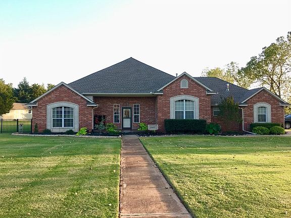 Well kept home that sits on a gorgeous 1 acre lot, just 20 minutes from downtown OKC. Throughout the home, you will find custom woodwork, crown molding, and large windows w/wooden blinds. This house beams with natural light! The over-sized living room features 15' vaulted ceilings, large built-in cabinetry, and new wood-look tile. The spacious kitchen has a ton of storage, snack bar, an office nook, informal breakfast area, and a large formal dining room. Sip coffee & watch the sunrise on the covered front porch or spend your evenings entertaining under the large covered back patio. Additional Features Include: underground sprinkler system in front and in flower beds, 12 person storm shelter, shed with upper decking for additional storage, wrought iron fence, 2 car garage w/XL space for motorcycle parking or workshop-size of 3 car, outlet on back patio for hot tub, surround sound, new mini-split heat/AC unit in Master, new carpet. Plenty of space for a large shop & pool. No HOA/CCRs