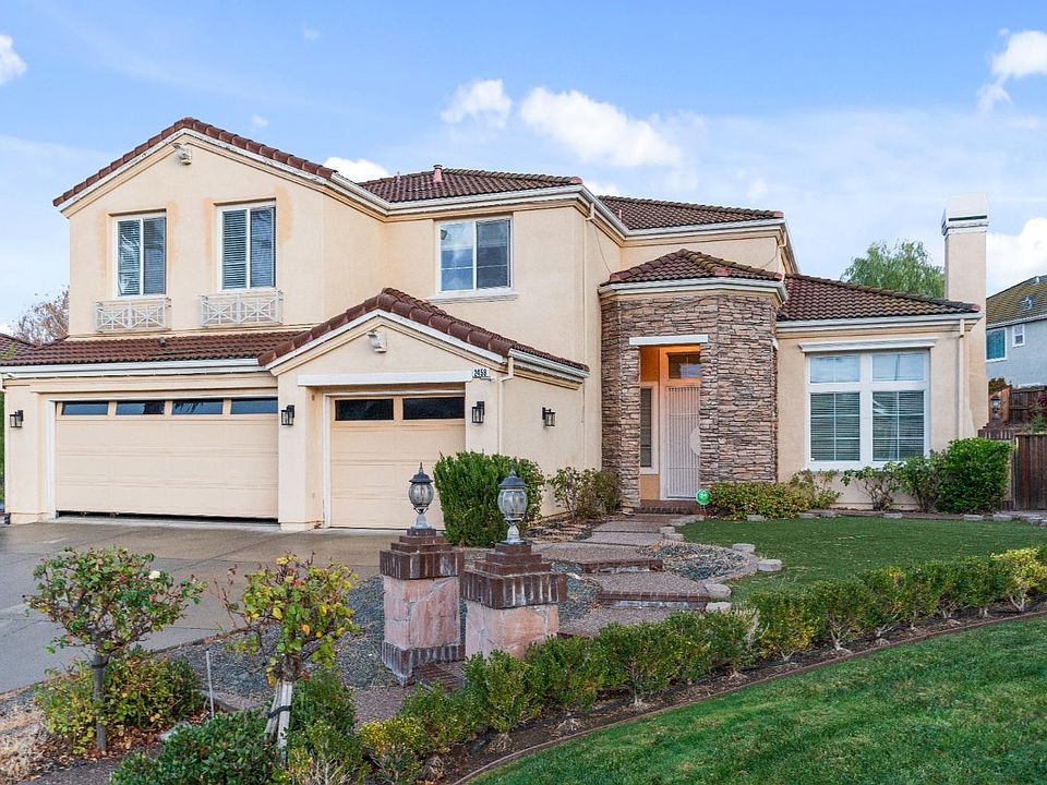 This stunning home on a quiet cul-de-sac offers room for all with 5 bedrooms, 4.5 baths, and a near 1/4-acre lot. The high-ceiling entry floods the space with natural light, leading to a family and dining room with two fireplaces and an oversized great room. The main floor features a full bedroom and bath, plus a guest half bath. Upstairs boasts a luxurious master suite and a junior suite with a full bath and walk-in closet. The large backyard includes a studio shed with dual-pane windows and a stucco finish perfect for a gym or office. Conveniently located minutes from shopping, freeways, and BART, this home blends comfort and accessibility. Make it yours today!