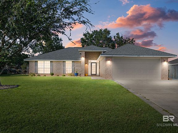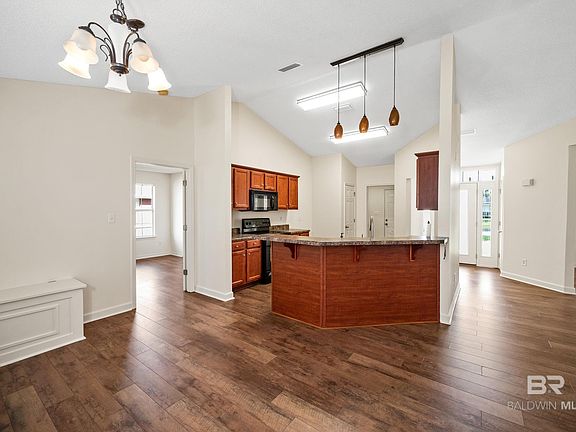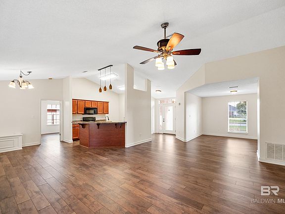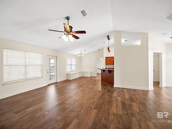 Perfectly located in Foley close to Publix, Walmart, Tanger, and Foley schools! A one-level 3 BR 2 BA open floor-plan with large living space and kitchen area perfect for entertaining. Newly painted and LVP floors throughout the entire home. The living room and kitchen have vaulted ceilings with an eat-in kitchen and custom built in seating. Primary bedroom is accompanied with private bath that offers double vanity, standing shower, and walk-in closet, as well as a linen closet. The guest bedrooms share a hall bath with tub/shower combo. Foyer area has a coat closet and additional storage is located in the hallway by the guest bedrooms. Step out of the back door onto a screened in back porch with a large back yard surrounded by a new 6 ft wooden fence. New landscaping in the front yard and an additional driveway was added for expansive parking area. New bronzed fortified roof. Buyer to verify all information during due diligence.