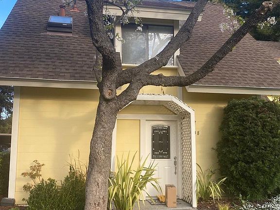 Lovely cottage like condo, Spacious living room w/lots of natural light opening up to spacious back patio. Updated kitchen w/desired amenities. Downstairs half bath & laundry area. Upstairs are two spacious bedrooms w/vaulted ceilings & mirrored closet doors. One includes a balcony overlooking the yard... Two deeded parking spots, plus extra storage. Desirable Charleston Village complex offers quiet living on gorgeous grounds. Washer/ dryer in unit, large back patio, great location- close to shopping and restaurants. Renter to verify schools but possibly - Monta Loma Elementary, Crittenden Middle School and Los Altos High .This standalone Townhome feels like a Single Family Home offering no shared walls & your own back patio. Small pet okay with pet deposit