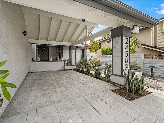 Charming 2 level, 4 bedroom, 2 bath plus loft/bonus room home in desirable Laguna Hills neighborhood. Expansive front patio area with planters and decorative stamped concrete. The open and free flowing floor plan provides an expansive wrap around great room with nook that includes built-in seating area and brick accented fireplace, and dining area with French doors to patio. The chef’s kitchen provides an entertaining open space, that connects with the family room, and includes a decorative beveled ceiling, garden window, marble counters, and wet bar with display cabinets. The family room includes built-in entertainment center and access to the back patio. The downstairs master bedroom has lovely wood floors and an extensive master bath room with dual vanities, and custom tile shower with seating. The entertaining space continues outside to the wraparound covered back patio with tiered landscaping and planter area parallel to the kitchen and family room. Additional amenities include ceiling fans, wood floors, laundry room with cabinetry, updated bathrooms. No HOA.