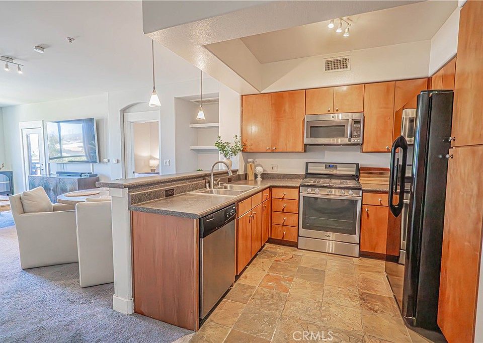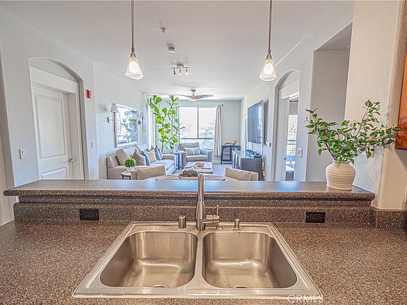 Modern Comfort Meets Prime Location. Discover effortless living in this thoughtfully designed 2-bedroom, 2-bath condo. The kitchen is equipped with stainless steel appliances and durable Corian countertops perfect for casual meals or hosting friends. Just off the kitchen, a spacious family room flows into a living area featuring a built-in desk, ideal for remote work. Step outside to a private balcony accessible from both the living room and primary bedroom, offering a peaceful retreat for morning coffee or evening relaxation. Inside, a blend of carpet and tile flooring provides comfort and easy maintenance throughout. The primary suite boasts a walk-in closet and a private en-suite bath with dual sinks. The secondary bedroom also includes its own walk-in closet and direct access to a second full bath, ideal for guests or shared living. The unit includes its own side-by-side washer and dryer tucked into a convenient laundry closet. Enjoy resort-style amenities including two reserved parking spaces, secure building access, elevators, a fitness center, private movie theater, clubhouse, and BBQ area perfect for entertaining or unwinding. Located in a vibrant, walkable neighborhood just steps from Westfield Mall, boutique shops, wine bars, dining, nightlife, scenic paseos, and bike paths, this home offers the ultimate blend of convenience and lifestyle.