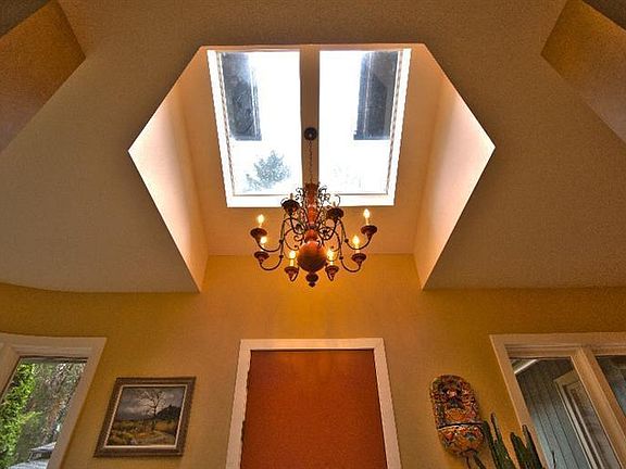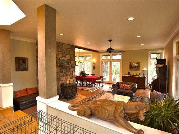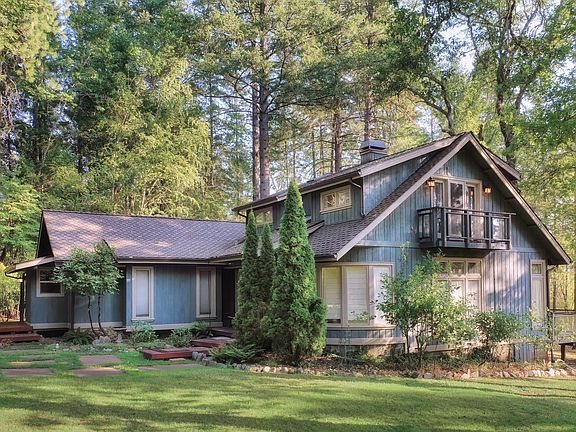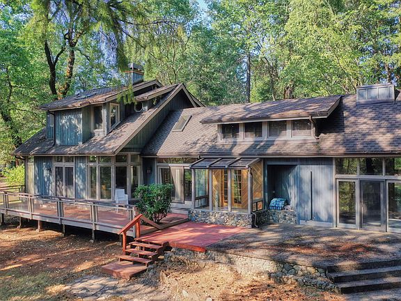 Beautiful custom home nestled among the trees on 5.7 acres. A well appointed primary dwelling + Private 2 bed / 1 bath cottage! Main home has hardwood floors and soaring ceilings with an open and inviting sunken living room. There's also dedicated office space, formal dining and a separate rec room with floor-to-ceiling windows. Modern kitchen includes stone countertops, tile backsplash, stainless gas range and plenty of storage. Enjoy al fresco dining from the large redwood deck. Split floor plan features two primary suites. First room has vaulted ceilings, dual walk-in closets and a modern bathroom. Second suite has a private bath and functional built-ins. The cute cottage includes vaulted ceilings, good size bedrooms and a convenient loft area. There's also 960 sq./ft. detached garage, carport with storage and more. So much to love about this property!