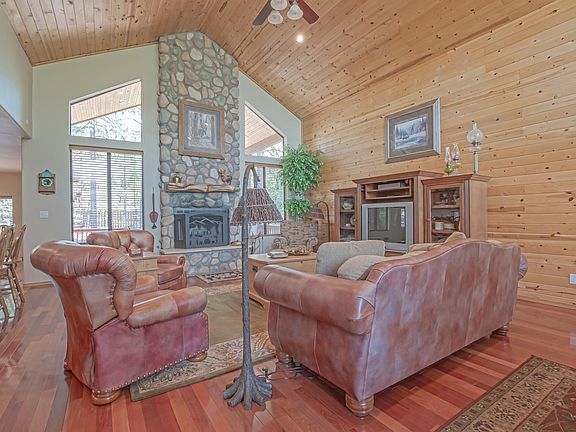Take a look at this great Pinetop home! Mature pines on the 0.53 acre lot provide a private setting. Sit out on the covered front deck to enjoy the surrounding natural views. Inside, floor to ceiling windows invite generous natural light. Tongue and groove details alongside with the stonework fireplace add warmth to the space. The large kitchen island makes for excellent seating and prep space. Solid surface counter tops are both beautiful and practical. The private master suite awaits after a long day. Step out of the elegant french doors to the deck for fresh air. Soak away your worries in the jetted tub. A large walk in closet will fit your wardrobe with ease! Two additional choices of bedroom make this home an excellent choice for families or hosting guests.