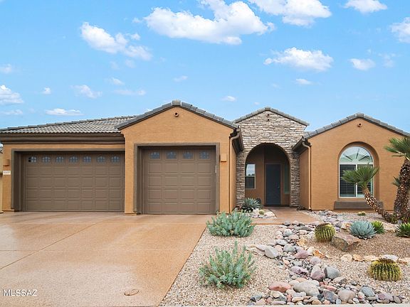 Located in a gated community with a golf course setting, this home has nice curb appeal with stacked stone facade, and desert plantings. The golf course views permeate your serene living room space while soft color tones create a relaxing atmosphere surrounding the fireplace and media alcove. A sweeping archway opens to the formal dining area and the kitchen nook provides a more casual space for everyday dining. Your contemporary kitchen has granite countertops highlighted by tile backsplash with under-cabinet lighting, stainless appliances including a gas cooktop, wall microwave/oven, and a butler's pantry. The owner's suite has a corner soaking tub and separate shower, and a dual sink vanity including a center makeup station. A magnificent outdoor space is just waiting for you with a full length covered patio, built-in grill, colorful brick pavers and a circular seating area emersed in desert vegetation, river rock designs and numerous cacti species. Relax and enjoy the stunning views of the manicured golf course green, native desert grasses and trees, and the awesome backdrop of the majestic Santa Rita Mountains.
