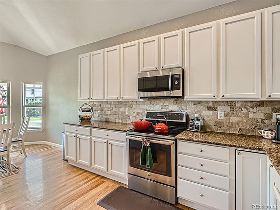 Welcome to this meticulously maintained 2-Story home with a walk-out basement in Tollgate Crossing!! This home is situated on the perfect lot that backs to open space with a stream, bridge and easy access to the neighborhood pool and clubhouse. Home features; 4bd, 3ba, luxury finished 3 car garage with all NEW roof and gutters, heating and air-conditioning, whole house attic fan, hot water heater, hardwood flooring, LVP flooring in bathrooms, interior paint, exterior smart Trimlight lighting around the house that changes colors and patterns, trex deck, and so much more! Walking in you'll notice the open floorplan with vaulted ceilings, hardwood floors throughout, gourmet kitchen with bright white cabinets, granite countertops, custom backsplash, stainless steel appliances, and breakfast nook. Separate dining area located next to the kitchen gives this house plenty of space for holiday gatherings and entertaining. Spacious primary bedroom is located on the main level and has it's own private 5-piece bathroom with garden tub and walk-in closet. Moving upstairs are 3 additional bedrooms and 1 full bathroom. House come with smart options such as; 9 ring cameras, doorbell, thermostat, sprinkler controller, garage door opener, garage door lock, and exterior lighting. For all those car enthusiast, this dream garage comes with epoxy coated flooring, heater, LED lighting, cabinets, and extra electrical. Step outside and experience the beauty of the elevated views from the new trex deck! Community pool, clubhouse, playground, all walking distance. Short distance away from Southeast Rec Center, Fieldhouse USA, and Southlands mall. Elementary and Middle school are walking distance. Excellent location in a very well-maintained neighborhood within the award-winning Cherry Creek School District. Don't miss out on this one!!