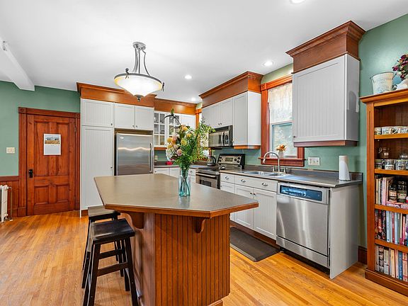Welcome to this exquisite century home nestled in the heart of Kensington, where historic charm meets modern elegance. Boasting a multitude of updates and a captivating blend of timeless character, this home is a true gem with unparalleled comfort and style. You'll immediately be enchanted by the character and warmth that this home exudes. An inviting foyer welcomes you with its original hardwood floors and intricate details. This residence has ample space to accommodate your family's needs. The heart of this home is the stunning modern farmhouse kitchen, a true chef's dream. It features an oversized eat-in area and a spacious island that serves as the centerpiece. The kitchen seamlessly flows into the family room, creating an open and inviting atmosphere. Large windows fill the space with natural light, and a fireplace adds a cozy touch for those chilly evenings. This layout ensures that family and friends can gather and connect effortlessly, making it the ideal hub for your daily life and entertaining needs. On the main level, you'll discover a bedroom suite that is not only a private retreat but also a versatile space with an attached living room. A main level laundry room and an additional bathroom further enhance the convenience of this home. One of the standout features of this property is the wrap-around covered deck. This enchanting outdoor space is perfect for enjoying your morning coffee, or simply unwinding after a long day. Upstairs, you'll find three spacious bedrooms, each with unique charm. The den offers additional space that can be transformed, depending on your needs. The attic, a hidden treasure, is ready for your vision. Whether you dream of creating a master suite, a home theater, or a cozy library, this space offers limitless potential to tailor it to your desires. Outside, the backyard is a true oasis, with lush landscaping, a variety of mature trees, and a multitude of flowers. The detached garage offers ample storage and hobby space.