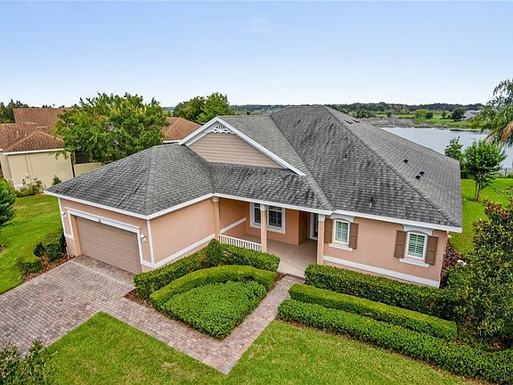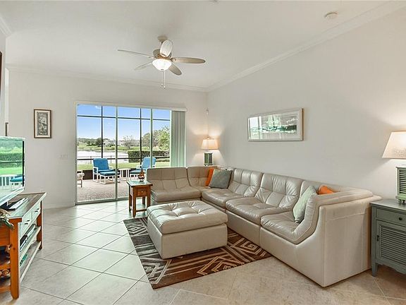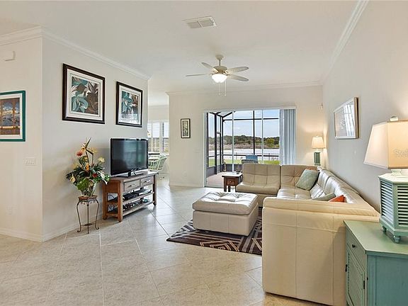 Welcome to lake front paradise! This home features 2 beds/2baths plus bonus room; that can be used as an office/den or 3rd bedroom. The master bedroom is spacious with it's own a 5 piece bath and double master closets. The second bedroom and office/3rd bedroom are separated by the second full bathroom. It has ceramic tile installed diagonally throughout except master and guest bedrooms have carpet. The adjoining dining and living rooms overlook the extended screened-in lanai. Additionally, the conservation view can be enjoyed from the master bedroom, living room, breakfast room, kitchen and bonus room. Upgrades include crown molding plantation shutters and Silestone quartz counter tops. The home welcomes you with mature landscaping and keyless entry front door. This low maintenance, energy efficient home features Solar, double-pane windows, core foam insulated concrete block with stucco. The home furnishings are available for purchase separately. You will also get to enjoy the 57,000 sq ft Clubhouse and amenities with pool, hot tubs, tennis, pickle ball, restaurant, bar, billiard room, crafts, yoga studio, demonstration kitchen, golf simulator and ballroom and so much more. A home like this doesn't come on the market often. Don't wait to be the new owner!