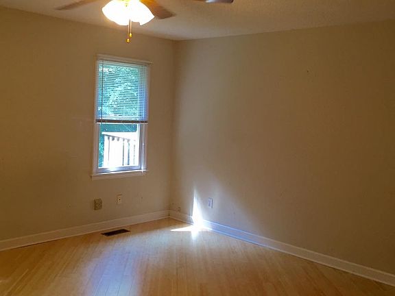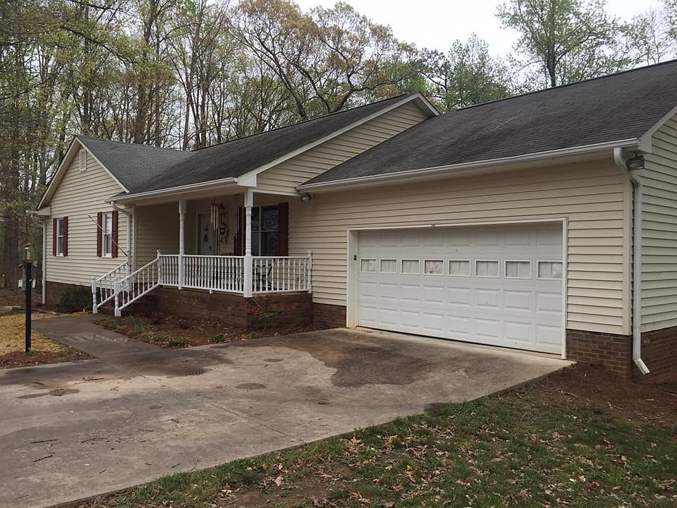 Private setting off main road with paved frontage on .89 acre lot.Updated with bamboo floors,two free standing gas fireplaces and double level deck.Cathedral ceiling in den.Basement could be 4th bedroom or game room.Over 2000 sq. feet heated and cooled.Recent central air unit and water heater.Shelfing in garage and basement stay as well as stove and refrigerator.Concrete driveway and walkway plus heated garage.Bamboo hardwood floors inmost of house.