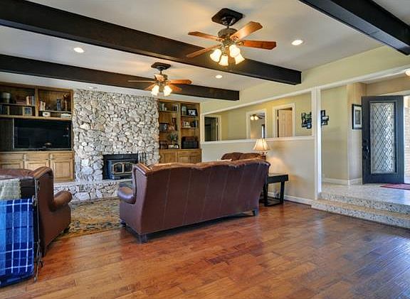 Beautifully remodeled ranch style home on 5 acres, with 2 stone fireplaces open concept living. Kitchen has granite, new ss appliances, gas cooktop. Master suite has fireplace, large living area. MB has separate vanities closets,toilets, jetted tub, build-ins. Split BR, storage shed, entire property is fenced for dogs and hoses, solar gate. 5 acres right next to this property and can be purchased in addition to this 5 acres.