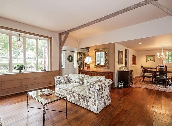 Charming 3 bedroom, 3 full bath Cape with first floor master. Highlighted by beautiful wide board floors, the spacious living room offers a fireplace, bay window and beams and is open to the dining room as well as the slate floored sunroom with French doors. The fun, retro kitchen design features a cozy built-in breakfast nook. The lower level walk out family room also has a fireplace and lots of storage. The house is set back from the road on two level acres in a great neighborhood close to Ambler Farm and conveniently located in South Wilton close to Westport, Weston and Wilton town centers, offering easy access to train and all major highways.