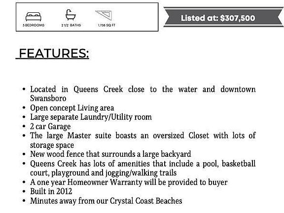 This beautiful home is located in Hubert at Highlands at Queens Creek and is close to the water and downtown Swansboro. You will love this three bedroom two and a half bath home with 1738 square feet of living space. It is just twenty minutes away from our Crystal Coast beaches. Lots of light fill this home with its large windows. It boasts an oversized master suite with a large walk-in closet! This home has tons of storage space and large utility room. Around the perimeter of the yard stands a brand new wood fence that provides private space and invites relaxation. Highlands at Queens Creek is a quiet neighborhood with homeowner amenities like jogging/walking trails , community pool, basketball court, and a playground. Seller will include a one year home warranty with America's Preferred Warranty. Schedule your showing!