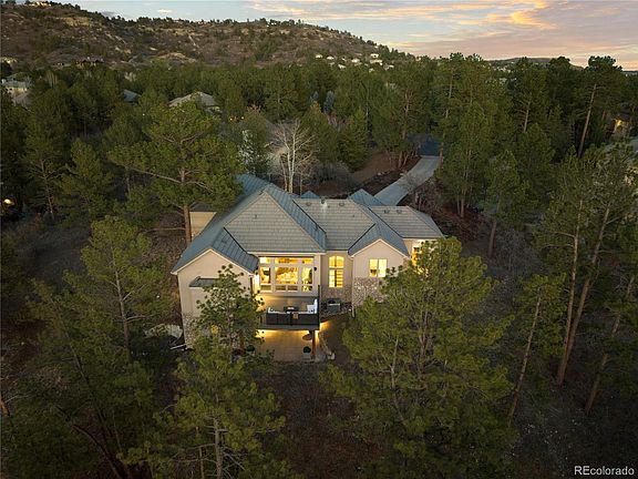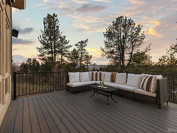 Situated in picturesque Castle Pines Village, this home is snuggly set up at the end of a tree-lined street on a premier lot boasting privacy and mountain views. Inside this chic, boho styled home you will find extended hardwood flooring on the main level, a sun drenched living room adjacent to the formal dining room for comfortable entertaining. The bright and cheery kitchen features abundant countertop space, 42 inch cabinetry, high-end appliances and beautiful Quartz countertops. The open kitchen/family room combo blends seamlessly creating one fabulous space for cooking, conversation, and relaxing. Out the family room door you will find a nearly new (no maintenance) deck that is truly an oasis. Whether it’s your morning coffee or an afternoon BBQ, this deck provides serene privacy and peek-a-boo mountain views. A truly peaceful spot only interrupted by the sounds of elk bugling in the evening. French doors lead to the private primary bedroom that is highlighted by a spacious 5-piece bathroom, two closets, and a secluded patio with more views! The main level is finished by a handsome study with built-in bookcase and large windows. In the fully finished walkout basement you will find a fabulous theater room, workout room, and additional entertainment space that walks out to the ultra-private backyard. Down the hall there are two spacious bedrooms with a jack & jill bathroom and a private guest room with ensuite bathroom. In sum? It’s the total package.