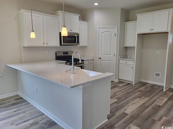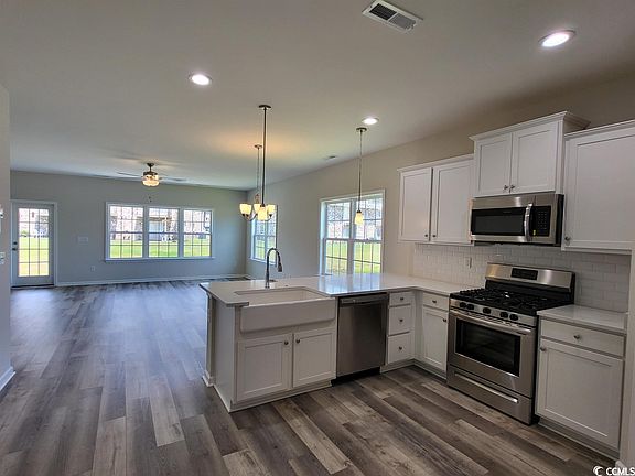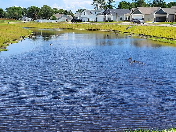 Golf cart to the beach from this beautiful Sandpiper floor plan, surrounded by the pond on two sides, by the local builder voted Best of the Grand Strand and Best of the Beach for the second consecutive year! In the Ocean Palms community (Voted Best Neighborhood!), and almost complete and ready for you to move into. A welcoming front porch, a large rear porch and tons of windows to frame the gorgeous pond views are the defining features of his home. This terrific 3 bedroom, 2 full bath, 1 half bath, open floor plan home has wood-look waterproof LVP flooring throughout the first floor, with carpet on the second floor. Stainless appliances, staggered-height white Shaker-style cabinetry, quartz counters, a cast iron farm sink, a corner pantry and a convenient breakfast bar combine to give the kitchen the wow factor you're looking for, and the abundant recessed and pendant lighting, two sets of double windows, one set of triple windows and a full glass door flood the home with light. The glass door leads to a covered porch with a large separate patio, to take advantage of the beautiful pond view. The spacious owner's retreat features quartz counters with undermount double sinks and an oversized walk-in shower, with plenty of storage in the cabinetry and the huge walk-in closet. A half bath for your guests is tucked under the stairs and two additional bedrooms and a full bath are upstairs. All of the homes in Ocean Palms come standard with the luxury and efficiency of natural gas (tankless water heater, gas heat and a five-burner gas range). The fully-sodded yard has an irrigation system, front and back. The garage is completely trimmed and painted, with a wifi-enabled garage door opener. Ocean Palms is conveniently located near shopping, restaurants, schools and world class medical offices and hospitals, and a short golf cart ride to Surfside Beach's gorgeous beach and the Atlantic Ocean. Other floor plans and inventory homes may be available. Community pool and cabana!