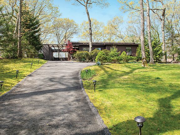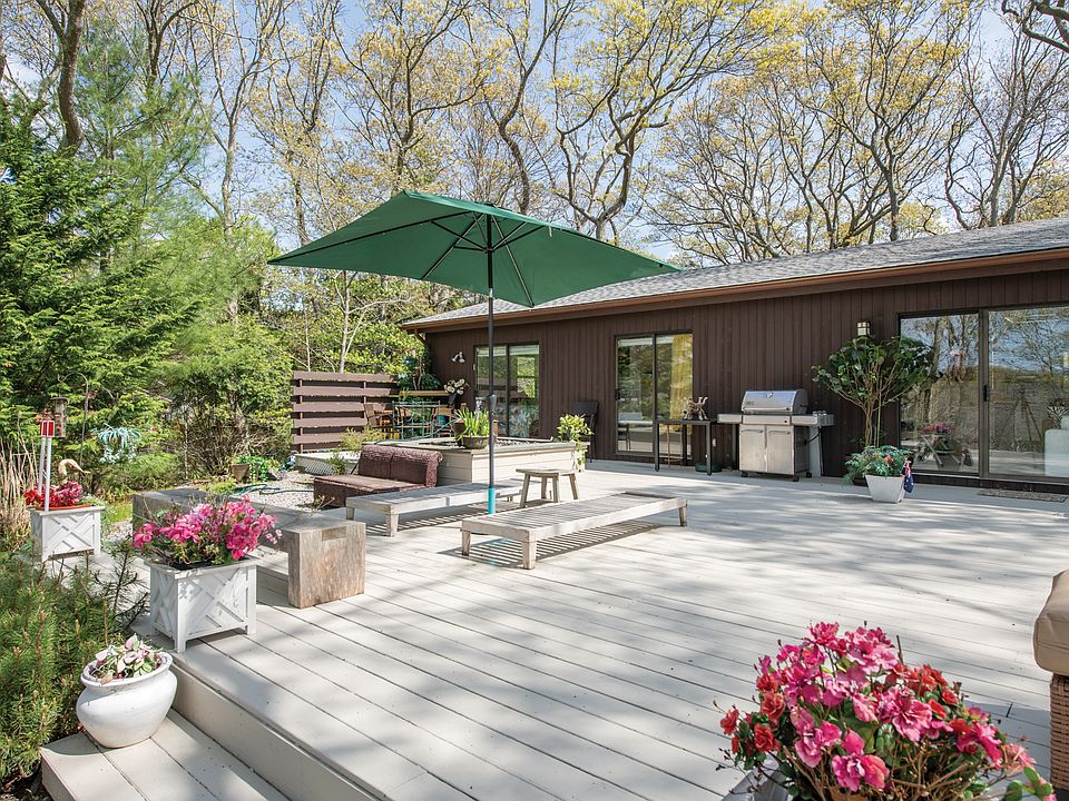 The panoramic view and tranquil beauty of bright orange sunsets over Little Fresh Pond beckon from high atop the hill that this lovely jewel of a home is perched on top of. At .83+/- of an acre, the beautiful views from both the landscaped and custom lit front yard and rear of the house are quite special. East and West exposures and a living room with 12' high ceilings boast lots of windows that allow the bright sun to stream in all day. This two bedrooms, two full bathrooms renovated gem features an eat-in kitchen with high-end stainless steel appliances and quartz countertops. A wood-burning fireplace featuring an architectural polished concrete mantle and the Pine floor along with the two full-sized spa baths add warmth and comfort to this special designer home. A large walk-in closet in the master bedroom provides ample storage. The spacious layout leading to the large deck is the perfect backdrop for entertaining and the ever-changing view of Little Fresh Pond never get old! Access to the rear deck is through sliding doors in both the living/dining room and master bedroom. The gentle sounds and undulating water of a water sculpture on the deck provides a truly Zen-like atmosphere. Enjoy swimming and canoeing in the pristine waters of the pond which is accessible from your dock. There is room for a pool and all wetlands setbacks as mandated by Southampton have been approved and are ready for permits to be issued. Additionally, approval has been granted for a proposed renovation with permits ready to be issued. Other features include central heat and air, ADT security system, satellite dish tv, in-ground irrigation, and an invisible electronic and deer fencing in the back assure safety and security for pets. The peace and quiet of Little Fresh Pond are conveniently located just minutes from the shopping and restaurants of Southampton Village, its' ocean beaches and neighboring towns.