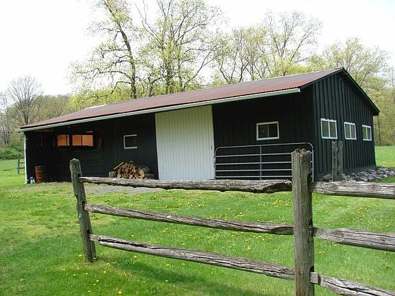 Unique 2, possible 3, bedroom home on 10 acres, surrounded by farmland, close to major routes and riding trails, with 5 stall oak board barn with tack room, water and electric, riding area and pastures. Barn has large storage area, which holds plenty of hay bales. Home is move in ready and has a working stone, floor to ceiling fireplace in LR, large kitchen with newly installed granite countertops, and an open floor plan. Wood stove in basement keeps the home toasty warm during the cold winter nights and efficient, ductless A/C cools during the hot summer months. First floor has new pergo floors and loft and second floor is carpeted. Deck wraps around front and side of home, which would be great for entertaining. Enjoy nature and wildlife right outside your door. New well pump recently installed.
