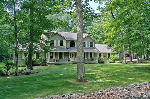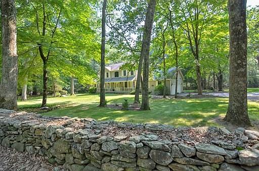Surrounded by beautiful stone walls, this stately colonial is situated on 2+ manicured acres. In addition, a legal stand-alone In-law offers an additional 840+ sq ft of living space. The farmers porch will welcome you into the 2 story soaring foyer. Huge tiled kitchen with updated appliances, center island, desk space, eat in area with slider to the maintenance free deck is perfect for those beautiful evenings. The living room offers French doors for privacy, the dining room is nicely situated by the kitchen for convenience, the 1st floor laundry and half bath are tucked away off of the kitchen. The sunken great room is warm and inviting, with hardwood floors and a floor to ceiling stone fireplace with French doors that lead to custom bluestone patio. The grand oak staircase leads to the 2nd floor. The Master bedroom offers a walk in closet, updated bath, and beautiful hardwood floors. 2 additional bedrooms with hardwood floors are serviced by a full bath. The finished lower level is
