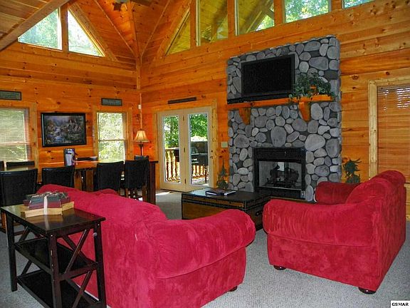 Log cabin with lots of tongue and groove walls, floor to ceiling windows and sitting in a cul-de-sac for privacy. 4-bedrooms each with own private bath. 3-levels of fun for the whole family. loft game room, sitting room in basement and decks on all three levels. 8-26-14 rental income to date for 2014-$27,029.02.