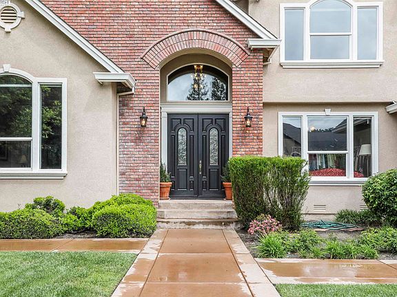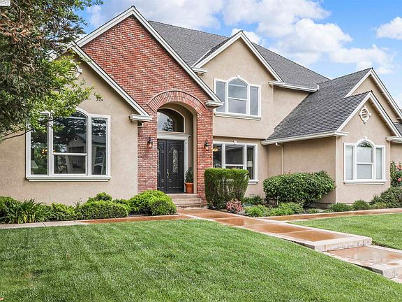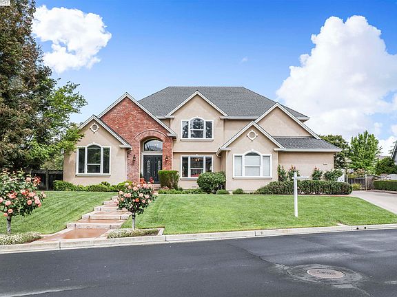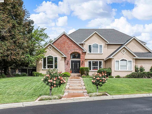 Nestled in a quiet cul-de-sac, this lovely custom home is a masterpiece of craftsmanship and design. Attention to detail is apparent the moment you step into the entry with its circular staircase and custom molding. The living room features a peaked ceiling, marble fireplace, and custom millwork; the dining room with crown molding, custom wainscoting, and 10’ ceilings adds elegance to any gathering. The chef's kitchen boasts granite countertops, custom cabinetry, Wolf range, and black stainless appliances adding both style and function. An island with a breakfast bar looks into the oversized family room where you'll find a stunning coffered ceiling and a large fireplace with a raised granite hearth. The laundry room connects the four-car garage to the kitchen with an adjacent half bath. The first-floor bedroom with dual closets currently serves as an office. Upstairs are four spacious bedrooms and 2 full bathrooms. The master bedroom features a tray ceiling with crown molding, an adjoining sitting area, and a walk in closet. The spa-like master bath has an oversized shower, jetted tub, and dual sinks. Outside, the large landscaped yard offers plenty of room for activities, while the RV area provides private storage. Conveniently located near Livermore Wine Country!