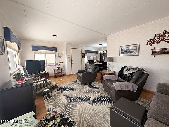 Don't miss this beautiful well-maintained furnished double-wide home on a premium size lot in Mesa's Trail Riders Ranch! This spacious 2-bedroom home has unique characteristics and natural light throughout. Laminate flooring in every room - no carpet! The kitchen features custom wood cabinets with soft-close doors and drawers, good size pantry and an eat-in kitchen. The formal dining area has a built-in hutch with a buffet. The primary bedroom has an ensuite bathroom with a shower. The guest bathroom has shower/tub combo and a linen closet. The second bedroom can be used as a guestroom and office, having two closets as well as a generous walk-in closet and access to the yard. Inside laundry with washer/dryer as well as another pantry. Motivated Seller. Other features include: New HVAC system installed (July 2024), water heater and reverse osmosis system (July 2023), metal roof installed about 10 years ago.