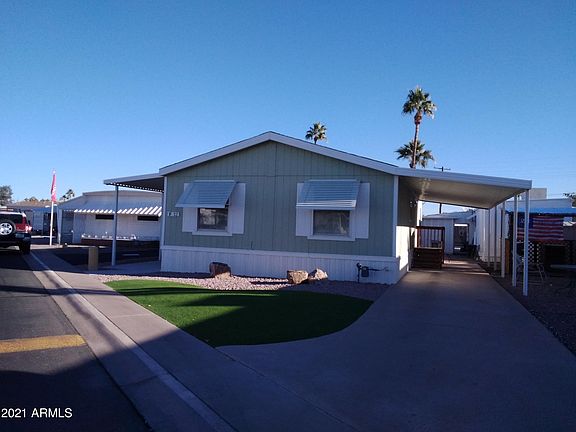 Check out this 2 bedroom, 2 bathroom Cavco home located in gated 55+ Trail Riders Ranch in Mesa. This great room home is 1,152 sqft and offers two carport parking. Take a dip in the heated, community pool and spa or join in a game of billiards or cards in the clubhouse. Meet your neighbors in the exercise room or while out on the putting green. Get out and play pickleball, bocce ball, or shuffle board. Maybe you just want to relax on your covered porch Located close to shopping, entertainment, Sloan Park (Go Cubs Go!) and freeway access. Land lease is $569/month. Resident requirements include 55+ yrs, credit, criminal and rental history background checks. A $50.00 non-refundable application fee/applicant. Pets are not allowed in this part of the park. Welcome Home!