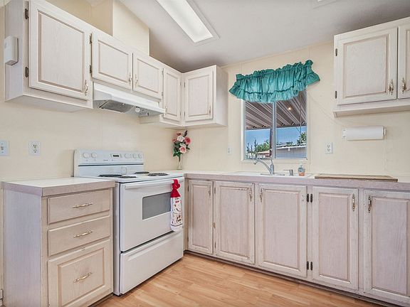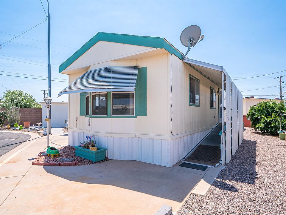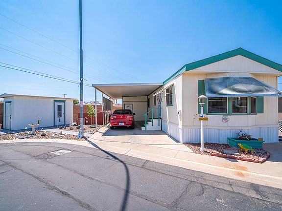 Enjoy the good life in this 2 bedroom, 2 bathroom home located in gated 55+ Trail Riders Ranch in Mesa. This 960 sqft home is located on a large corner lot with attached storage, in addition to a stand alone shed. Newer laminate flooring in kitchen, great room & hall. Covered carport parking for 2 vehicles, with wheelchair ramp. Take a dip in the heated, community pool and spa or join in a game of billiards or cards in the clubhouse. Meet your neighbors in the exercise room or while out on the putting green. Get out and play pickleball, bocce ball, or shuffle board. Located close to shopping, entertainment, Sloan Park (Go Cubs Go!) and freeway access. Land lease is $539/month. Resident requirements include 55+ age, credit, criminal and rental history background checks.