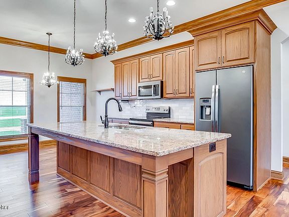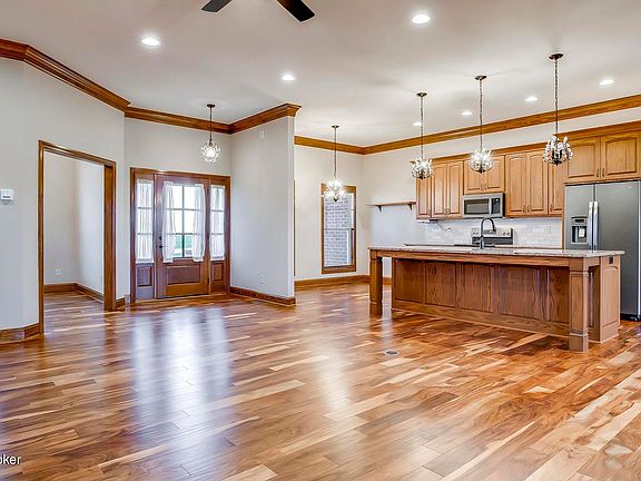 Enjoy the rolling countryside from this 4-year new, 3 BR, 2 Bath split ranch, chocked with beautiful detail. The 2368 sq ft, open layout with room to spread offers space to live, entertain, work and enjoy in comfort. The oversized, granite island and well-appointed kitchen with a walk-in pantry overlooks the living room, warmed by the luxury stone accented fireplace with detailed built-in side cabinetry. The kitchen is complemented with a formal dining room, breakfast area and separate sitting area, all open to connect in comfort and style. The detailed beauty runs throughout the home with wood plank flooring in the living areas and tile in the bathrooms and spacious laundry room. The primary suite has amble space with a vaulted ceiling, an oversized walk-in closet and a . . . well-accented primary bathroom. Enjoy the zero-entry walk-in glass shower with exquisite tile accent, along with a double bowl, granite vanity, and a separate sitting vanity and private water closet. The guest bedrooms have double door closets and share a tiled floor, granite top bathroom. The entire home is complemented by solid wood doors, extra closet space and plenty of natural light. Step outside to the spacious covered, low-maintenance concrete patio and take in the countryside. The longer driveway and oversized 2-car garage provide plenty of space for parking and storage. There is still opportunity to grow in the unfinished basement, with room to add a bedroom(s), and a pre-plumbed bath. Come see what country living in style looks like and take in the charm of Bloomfield, KY.