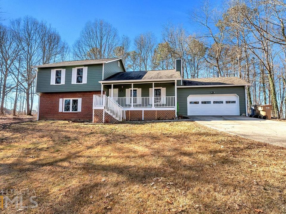 This beautiful split level home sits on 2.78 acres with No HOA. The long driveway welcomes you to the private wooded front yard as you cross over a stream. Enjoy your morning coffee on the covered front porch. Garage door enters into the kitchen with breakfast area, pantry, new granite countertops and beautifully tiled new white backsplash. Back deck just off the kitchen is perfect for barbecuing. Foyer entry into a spacious family room with a gas fireplace. Master and 2 secondary bedrooms are upstairs. 2 story storage shed with electricity in the fenced backyard. New siding, fresh interior and exterior paint, new doors, windows, garage door and carpet throughout. Convenient to major roadways, Mall of Georgia, restaurants and much more.