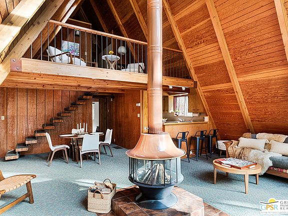 A rare opportunity presents itself to own almost a half acre on Strawberry Creek in Fern Valley! First time on the market, this property has been in the same family for 55 years! A circa 1966 A-frame cabin, spanning 1380 sq ft, embodies Idyllwild's charm with its minimalist mid-century design.Boasting 3 bedrooms plus a loft and 2 bathrooms, it offers ample space for relaxation and comfort. An inviting kitchen, featuring brand new top-of-the-line appliances including a compact cook's range and refrigerator, seamlessly opens to the living room and offers cozy bar seating for three. In the living room, natural light floods through floor-to-ceiling windows, illuminating the space with a soft glow in the late afternoon, while offering views of towering cedar and pine trees, with glimpses of Suicide Rock. A circular fireplace, swiftly warms the entire house, creating a cozy ambiance. Step outside onto the expansive deck to enjoy views of Lily Rock and the serene sounds of Strawberry Creek. Descend the stairs to access a private sanctuary by the creek, complete with pools and waterfalls. There are multiple storage spaces beneath the cabin, a designated laundry area, and a backup generator
