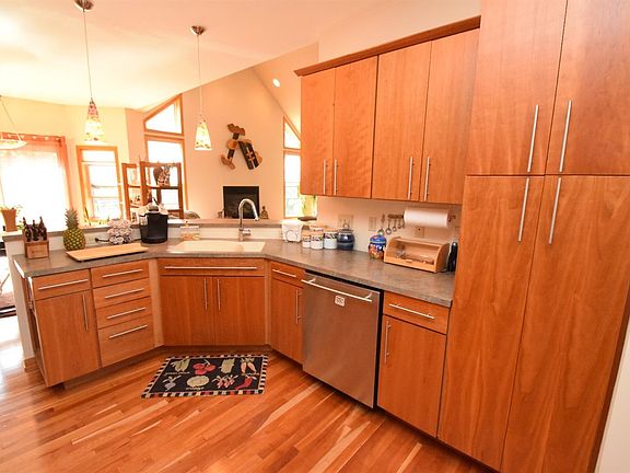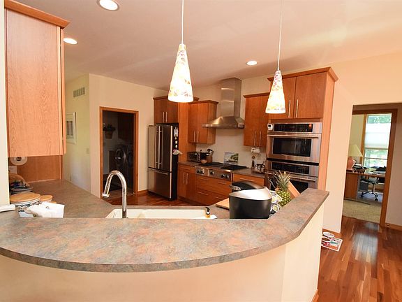 Contemporary style ranch home in desirable Abercrombie Woods subdivision. This home features a custom built wood staircase, nine foot ceilings,solid birch doors, cherry wood floors, cherry kitchen cabinets, and cherry cabinets in the laundry room(with pocket door). The master bedroom has a ten foot center ceiling and hickory vanity in the master bath. You'll love the fourteen foot ceiling and skylight in the foyer. Custom touches by the owner include shish kabob lighting in the entryway, seashell lights and box out shelving in the dining room and basement, wet bar in the basement with six bar stools, and three decks(10x20, 14x14, and 16x16) in the private back yard. All high end appliances are included. The basement includes a huge recreation room, a sewing room, and a guest room. Within minutes you can be at the beaches of Lake Michigan, the South Shore Train station, downtown Chesterton, downtown Valparaiso, and to Chicago via I-94 in 45 minutes.