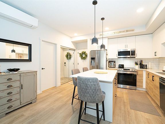 Welcome to SkyGate, where modern design and outdoor-focused lifestyle come together in the heart of Langford. This dog-friendly, ground-floor home offers the ease of step-free living with the comfort of a thoughtfully designed space—perfect for morning walks, weekend adventures, and everyday convenience. Built to Built Green standards and BC Energy Step Code 4, SkyGate delivers impressive energy efficiency and year-round comfort with triple-pane windows and an individual heat pump for heating and cooling. Inside, enjoy luxury vinyl plank flooring, quartz countertops, soft-close cabinetry, LED lighting, and spacious rooms designed for both relaxation and entertaining. Step outside your door and enjoy premium amenities including a rooftop deck, fitness centre, dog run, community gardens, EV charging, resident lounge, and secure bike storage. With trails, shops, and Westshore amenities moments away, this home offers an effortless, low-maintenance lifestyle you’ll love coming home to.