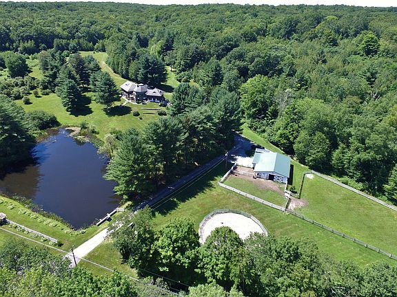 Known to many as "The Castle Home on your way to (or from) Litchfield." This well built 4 bedroom / 3.5 Bathroom gated equestrian residence with a field stone turret is majestically set on 15.25 gorgeous acres overlooking a sparkling pond and manicured lawn. The 3,000+sqft main floor boasts a grand- sized great room with enough room for 2 dining & 2 sitting areas, a wood burning fireplace built in to the stone wall of the wide center spiral staircase, a large retro-type kitchen and private bedroom wing. Everyone's favorite Romeo & Juliet balcony with panoramic views of the pond and front yard, is accessed from the great room. A new stone patio is right off the kitchen for outdoor dining or to simply enjoy the natural surroundings. The master bedroom has it's own full bath and private small balcony where the sun sets. Sip a cocktail or fruit smoothy right from your own bar in the lower level family room with adjoing recreational room....or relax in the sauna. The 5 stall barn with newer roof has 3 garages (about 200 Ft from home), 3 paddocks and a riding ring. Trail ride right on your own well groomed trails throughout the property. Many recent upgrades include: 18 windows, tile in LL family room and stone patio. Just 8 minutes to the Litchfield Green or the Center of Watertown, and under 2 hours to NYC.