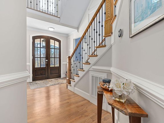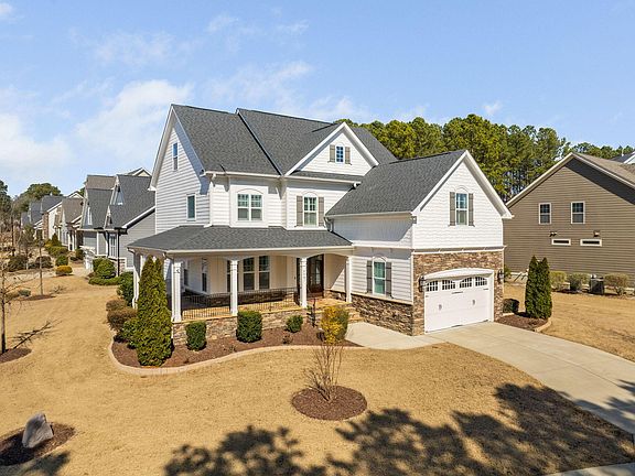 This breathtaking former Parade of Homes property is a must-see! From the moment you enter, you'll be greeted by a grand two-story foyer that sets the tone for the rest of the home complete with site finished hardwoods on the main level and 2nd floor common area. The carefully crafted trim work throughout enhances the elegance, complemented by plantation shutters in most of the spaces. The gourmet kitchen is a true chef's dream, offering ample space for both meal prep and casual dining. For more formal occasions, the dining room, featuring beautifully designed coffered ceilings, is sure to impress. The cozy family room with a fireplace creates the perfect atmosphere to relax with loved ones. On the main level, you'll also find a guest suite for added convenience. Upstairs, the luxurious primary suite serves as a peaceful retreat, providing ample room for both relaxation and privacy. With his and hers walk-in closets offering an abundance of storage, this suite is designed for ultimate comfort. The second floor also features two additional bedrooms and a versatile flex room, which could easily be used as a sixth bedroom. As if two levels weren't enough, the third floor includes a bedroom, full bath, and an expansive recreation room, perfect for any occasion. For those who enjoy outdoor living, you'll fall in love with the wrap around front porch and swing, the back screened porch and outdoor patio, complete with a gas-piped firepit—an ideal spot for gathering with family and friends. This home has so much to offer, and you need to experience it firsthand. Conveniently located near all that Raleigh has to offer, this is one property you don't want to miss!