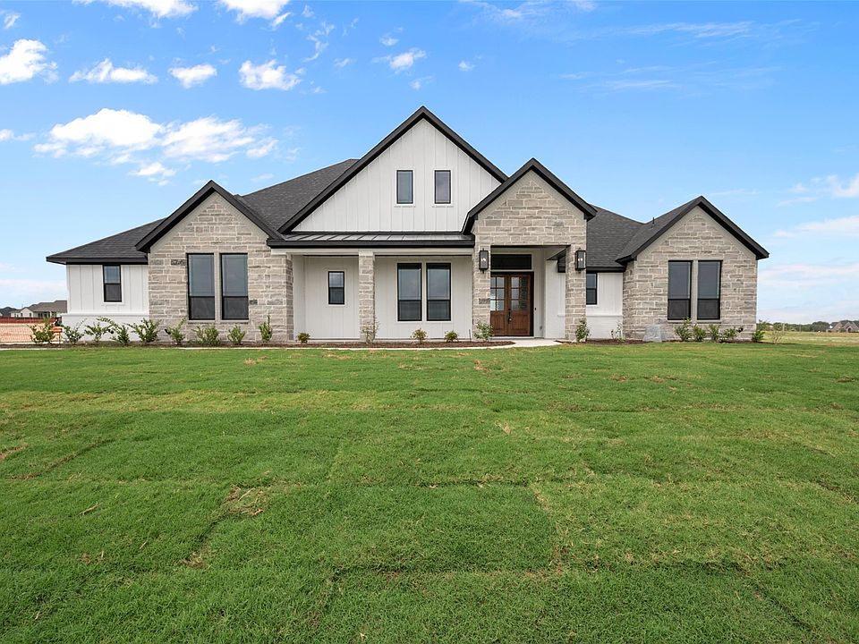 ***BUILDER INCENTIVE $7500 TOWARDS BUYERS CLOSING COSTS & IF BUYER WORKS WITH PREFERRED LENDER 1% OF LOAN AMOUNT WILL BE CREDITED TOWARDS BUYERS CLOSING COSTS IF CLOSED BY 12-31-25***Exquisite Country Estate – Refined Living on 1 Acre, Over 3,000 Sq Ft + 3-Car Garage. Welcome to your dream home! Experience the perfect blend of elegance, comfort, and function in this stunning 4-bedroom, 3-bath home, offering just over 3,000 square feet of beautifully curated living space on a 1-acre homesite. Just 12 minutes from I-35 for an easy commute. The heart of the home is a chef’s dream kitchen with richly stained cabinetry, a custom vent hood, an oversized island with designer pendant lighting, and premium Whirlpool appliances—including a 5-burner cooktop and a double oven and dishwasher. Built-in cabinetry and open shelving and a wine cooler in the eat-in area add charm and practicality and perfect for entertaining. Designed with functionality in mind, this home features a split-bedroom layout and a convenient Jack-and-Jill bathroom. The thoughtfully designed floor plan offers split bedrooms, a Jack-and-Jill bath, and a private office with a coffered ceiling. The primary suite impresses with a dramatic wood-beamed ceilings and a spa-like ensuite featuring dual vanities, soaking tub, and an expansive walk-in shower. The Bright, open living room enjoys abundant natural light and a cozy fireplace. Energy-efficient upgrades including foam insulation and tankless water heaters. The Oversized 3-car garage has room for your vehicles, golf cart and storage. Don’t miss the opportunity to enjoy quiet country living with modern comforts — all just minutes from the city. Schedule your private showing today!