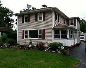 1880's farmhouse with vinyl siding and newer windows. Large living room, eat in kitchen and laundry/utility room. Enclosed Sun porch.First floor bedroom and full bath. Second floor full bath and two bedrooms and second floor sitting area. Extra room could be storage room. Boiler in 2011. Two upstairs rooms on electric heat. Tear off Roof in 2006. Vinyl siding in 2004, Windows in 2005. Two acre parcel with detached two car garage with shed off rear of garage. Above ground pool.