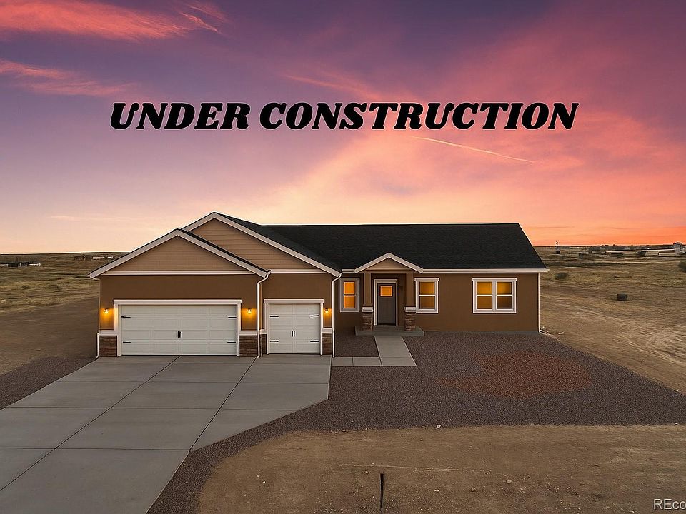 Welcome to this beautiful 3-bedroom, 2-bath ranch-style home in desirable Calhan! Situated on a full acre of land, this 1,680 sq ft fully electric home offers comfort, style, and efficiency. Inside, you’ll find 9-foot ceilings and a spacious open-concept kitchen and dining combo—perfect for gatherings and everyday living. The kitchen features granite countertops, a large island, GE appliances, and ample storage. Throughout the home, luxury vinyl flooring and plush carpet provide the perfect blend of durability and comfort. The elegant 5-piece master bath includes a soaking tub and walk-in shower for a spa-like retreat. A 3-car garage offers plenty of room for vehicles and hobbies, while the stucco exterior adds timeless curb appeal. Experience peaceful Calhan living with stunning views and modern finishes in a home built to last.
