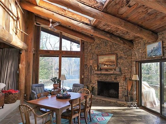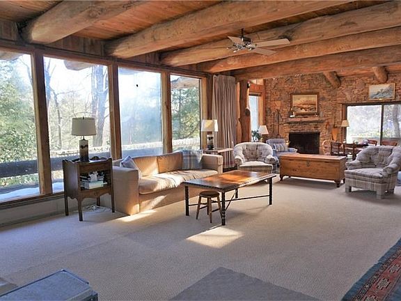 A piece of 7 Springs history! These homes were constructed by Herman Dupre & Lars Skylling. It's an incomparable opportunity to own your own legacy retreat across from the North Face entry gate. An architectural dream chalet featuring log post & beam construction, signature stone masonry, & floor-to-ceiling windows accompanied by separate guest house. With 5 bedrooms & 3 baths, the main residence has an expansive open floor plan including 2 fireplaces, Frank Lloyd Wright-inspired heated flagstone floors & an entertainer's kitchen with poplar cabinetry. You'll also find a dry sauna, wet bar, wine refrigerator, wine cellar, & usable basement. There's a wrap-around deck featuring milled beam handrail steps down to a stone path leading to the charming guest house. It offers 4 bedrooms & 2 baths - a perfect respite for visitors with rental potential. Rhododendrons, maple trees & pine flock the entire property which also includes a tennis court & perfectly appointed pond. Survey available!