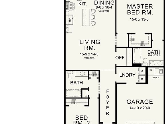 Single-level living at its best. No stairs, no cares! The Sinforosa is a simple luxury. With granite counters, stainless steel appliance equipped corner kitchen, and home chef coziness with pantry and all the conveniences a gourmet cook demands and dining area. It's ready for your Bon Appetite! All are connected to a large vaulted open and airy living area with a convenient office nook and generous-sized hide-away laundry room. The atmosphere is a complete home! On opposite corners and allowing total privacy, are a bedroom and master suite. The master suite has completely private full bath luxury quarters, a walk-in closet, and tons of space. It truly is a retreat to renew and relax. The bedroom on the opposite end has ample closet space and easy access to a full bathroom with a linen closet and quartz vanity. The generous space between bedrooms with an open concept living area in between allows complete privacy for life together. You will definitely want to take your inside to the outside and enjoy nature in the spacious yard! The Sinforosa is simple luxury living just waiting to call you home!