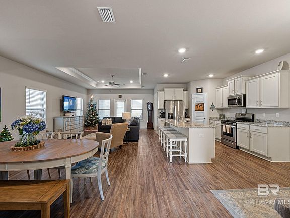 ^^^^^Seller offering $2500.00 in buyer credits^^^^^ ~~This home has a 2.9% assumable loan. Ask listing agent for more details. ~~ 24620 Slater Mill Rd is an all Brick home with 1,948 sq. ft. featuring 4 bedrooms and 2 baths, covered front and back porches and a two car garage. As you enter, the home features an entry way leading to the utility room off the garage and to the second bedroom with a chandelier and bay window. The open kitchen features an island and separate dining area. Just off the kitchen there is sitting area, to read, relax or be out of the way, while the cook prepares dinner.. The kitchen opens up to the great room with access to the back covered porch. The primary bedroom is just off the back side of the house with the primary bathroom featuring a large walk in closet, dual sinks, separate shower and large soaking tub and water closet. The third and fourth bedrooms are located off the kitchen area, and are separated by a hall closet and the second full bathroom featuring a linen closet and shower/tub. This home is Gold Fortified, which can save the homeowner on Insurance premiums and give peace of mind structurally. There are Hurricane window coverings that are easy to place, if needed. 24620 Slater Mill is in a great location when heading to the Gulf Coast Beaches, Mobile or Pensacola.
